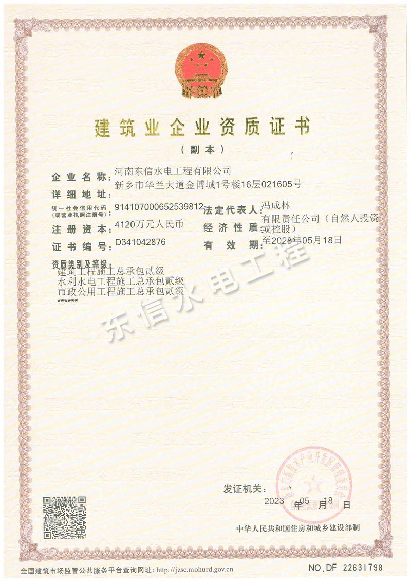 河南東信水電工程有限成立于2013年3月19日,位于新鄉(xiāng)市華蘭大道金博城1號樓。注冊資本金4120萬元,下設(shè)綜合辦公室、合同科、設(shè)備科、質(zhì)檢科、安全科、施工科、計劃信息科,即六科一室機構(gòu)健全。公司現(xiàn)有職工131人,其中有職稱的工程技術(shù)及經(jīng)濟管理人員43人(工程類高 級職稱1人,工程類中級職稱19人,經(jīng)濟師1人,會計師2人)。公司擁有各類工程施工機器設(shè)備74臺/套,機械設(shè)備總功率2238千瓦,可以滿足水電站、橋梁、堤防、大壩、交通、給水、排水、燃氣、環(huán)衛(wèi)、供電、通信、防災(zāi)等水利水電工程的施工需要。